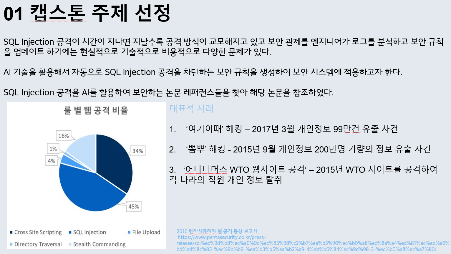 - 목적: SQL Injection 공격의 지능화에 대응하여 AI 기술을 활용해 공격 탐지 및 방어 규칙을 자동으로 생성하고 보안 시스템에 적용.