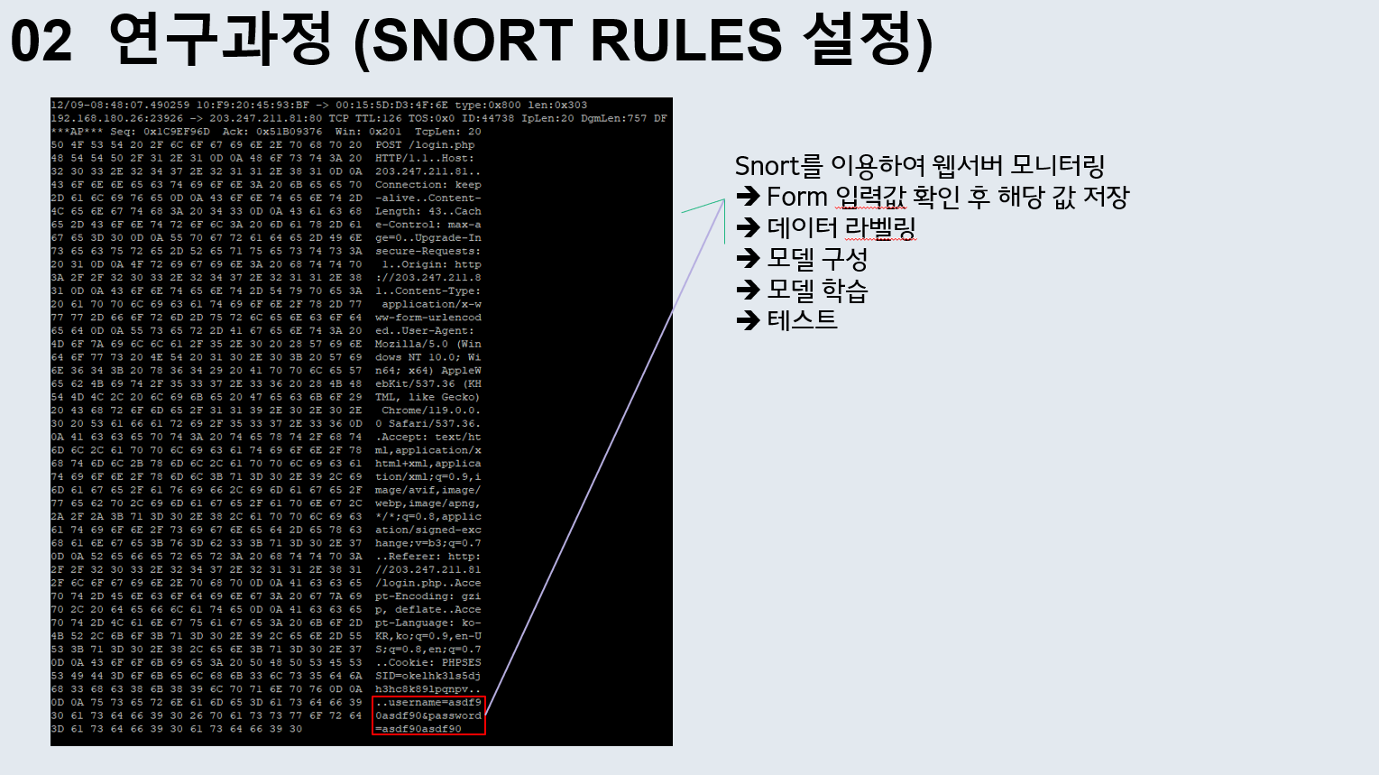 - SNORT와의 통합: 학습된 규칙을 SNORT 보안 규칙에 적용하여 자동화된 방어 체계 구축.